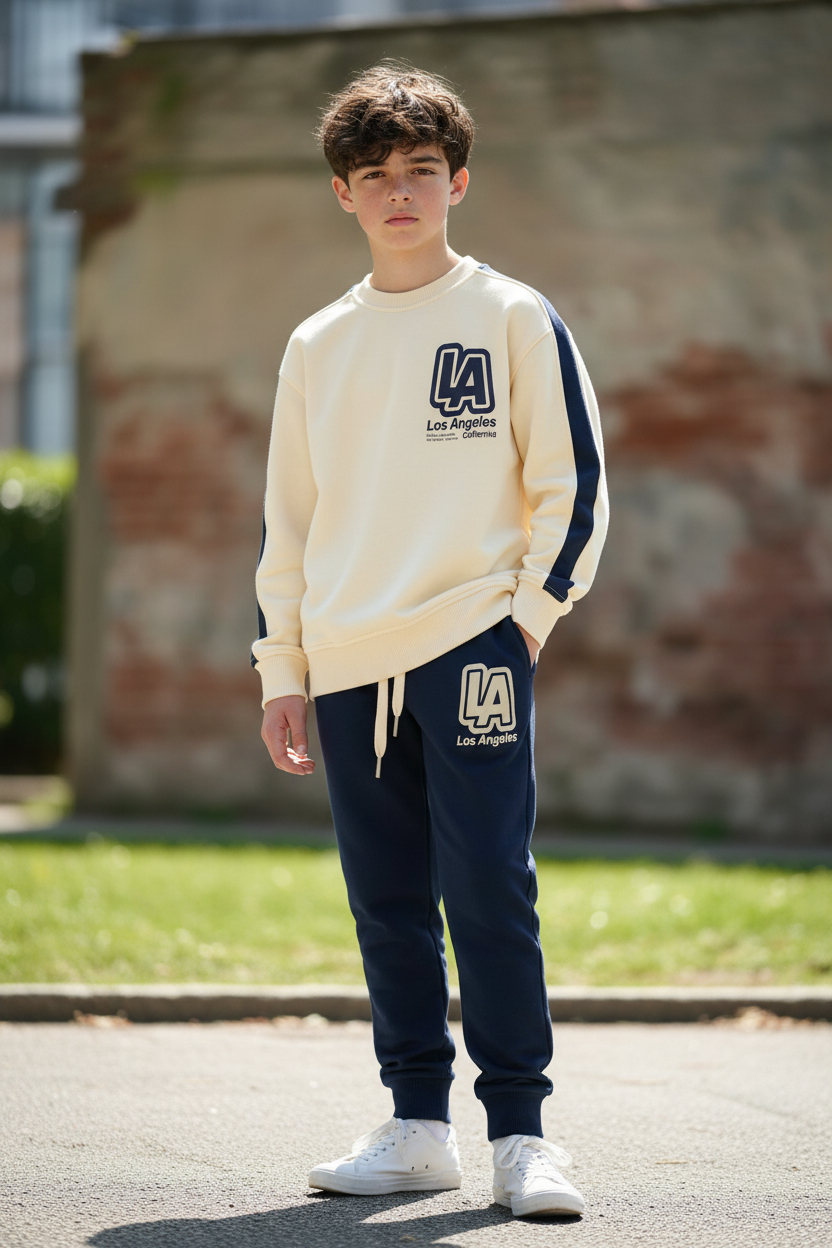 Jogging garçon confectionné dans un tissu molleton 100 % coton respirant , doux et confortable ,parfait pour accompagner les enfants au quotidien, le haut t-shirt col rond est orné d’une sérigraphie ajoutant une touche tendance au look ainsi que pour le pantalon assorti est doté d’une taille élastique pour un maintien confortable et une grande liberté de mouvement .