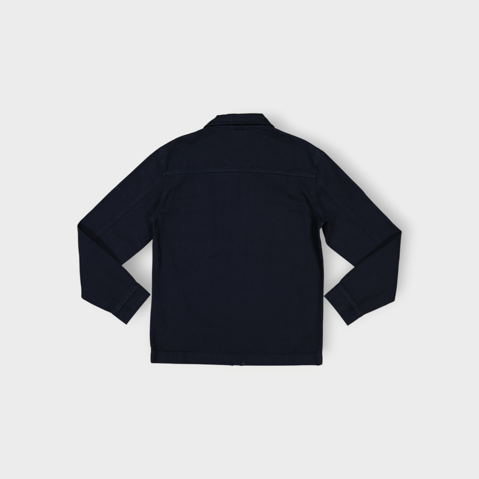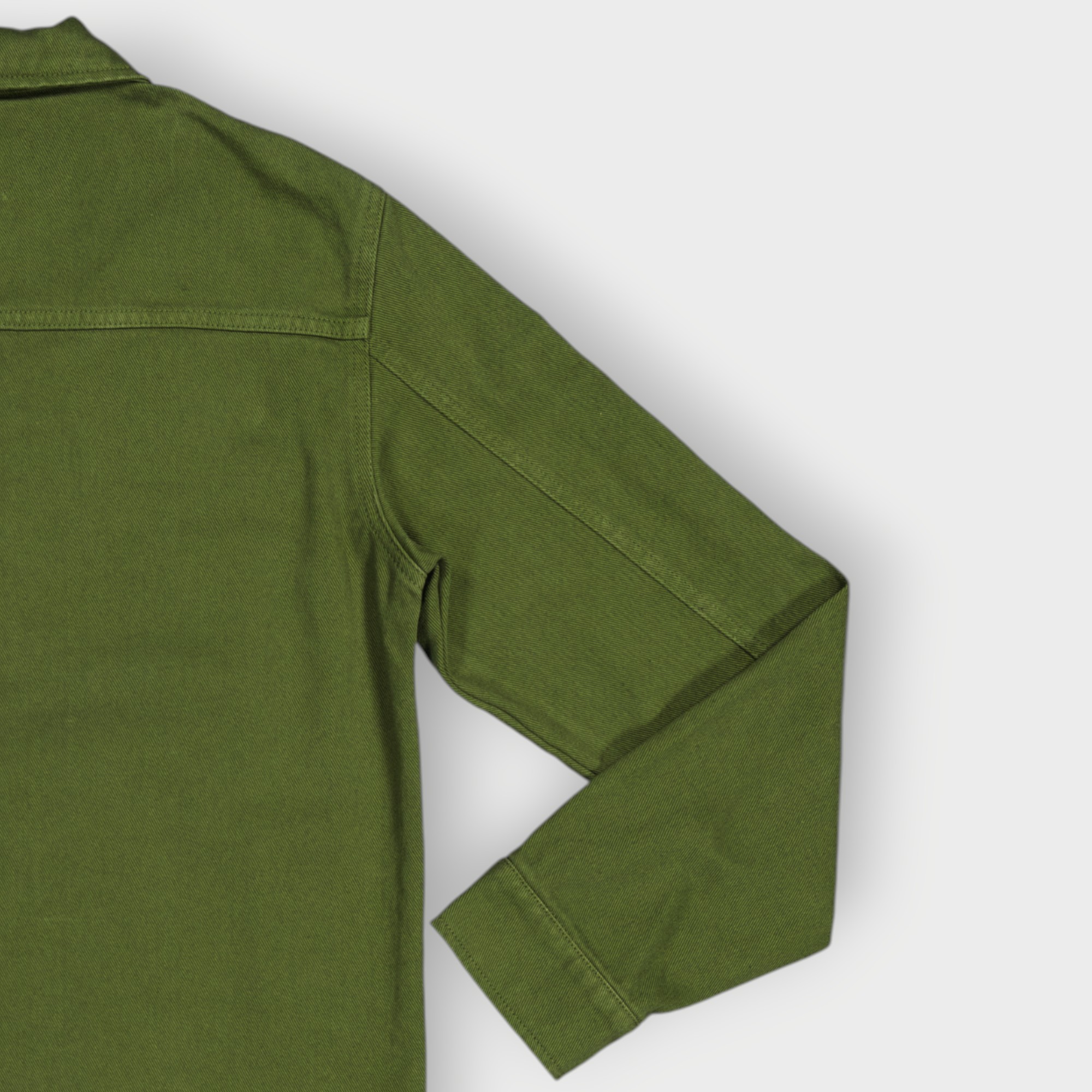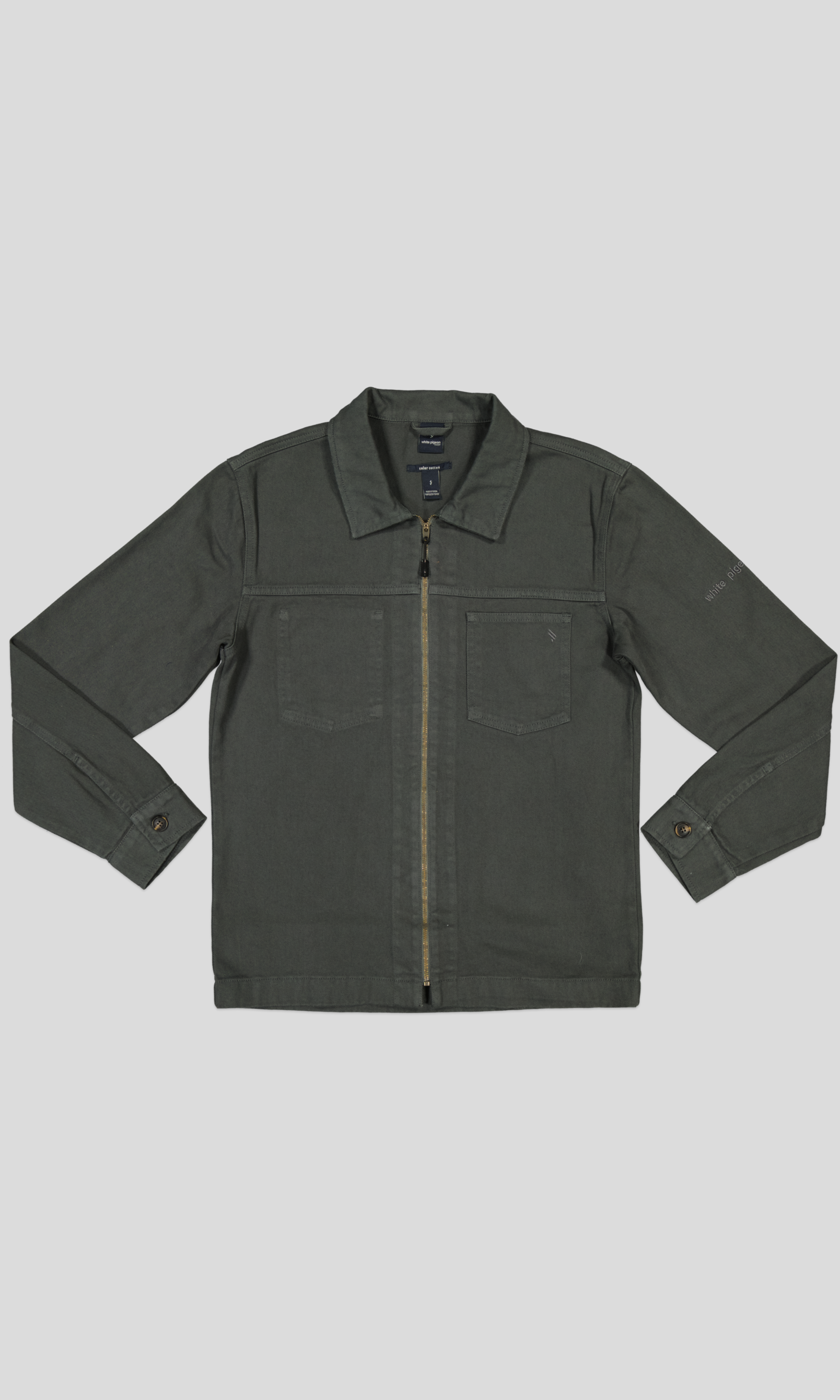 Surchemise coupe décontractée confectionnée avec tissu coton stretch. Col à revers et manches longues avec poignets à bouton. Détail de poche plaquée sur la poitrine. Effet délavé. Fermeture frontale avec fermeture éclair.